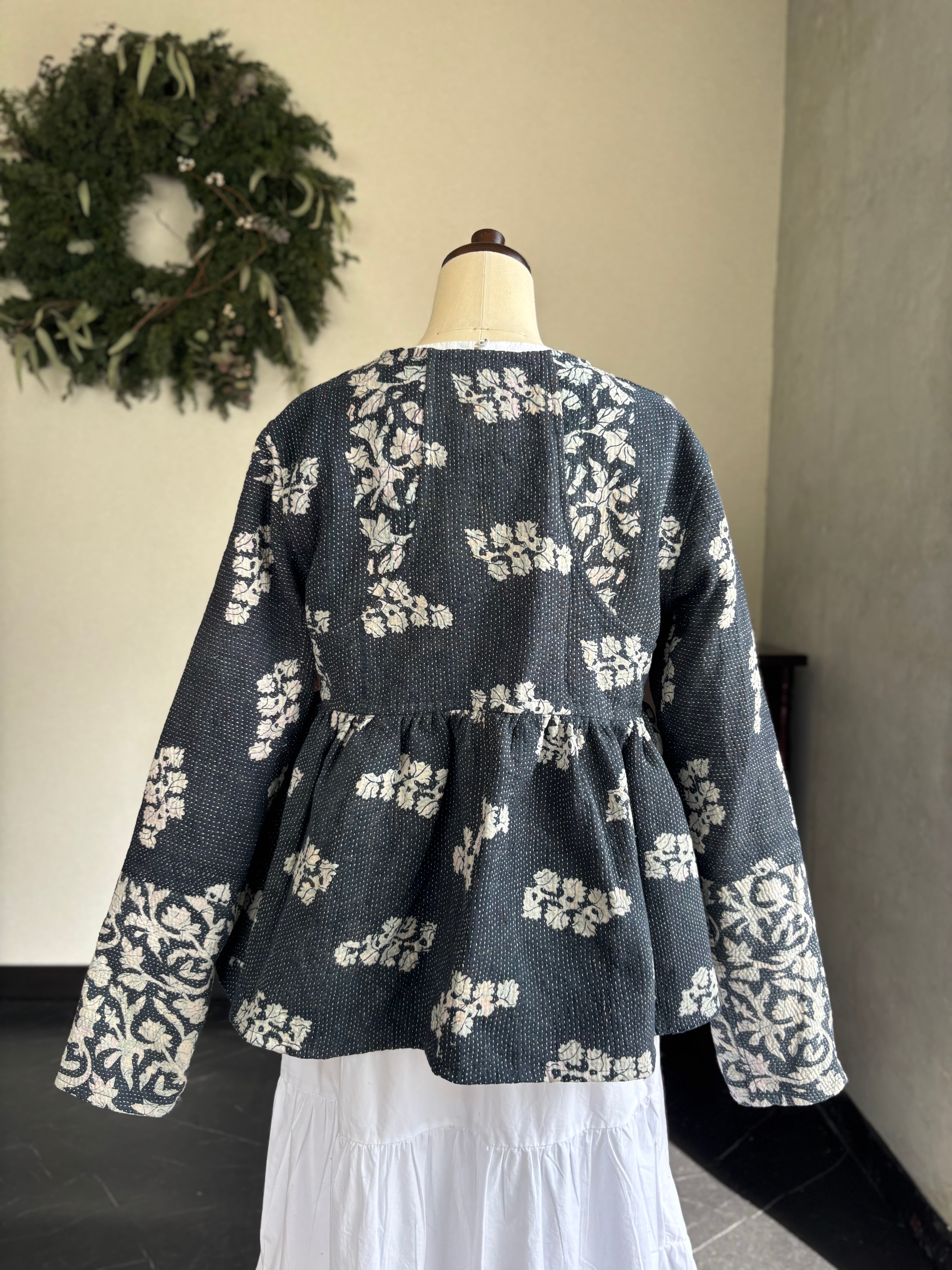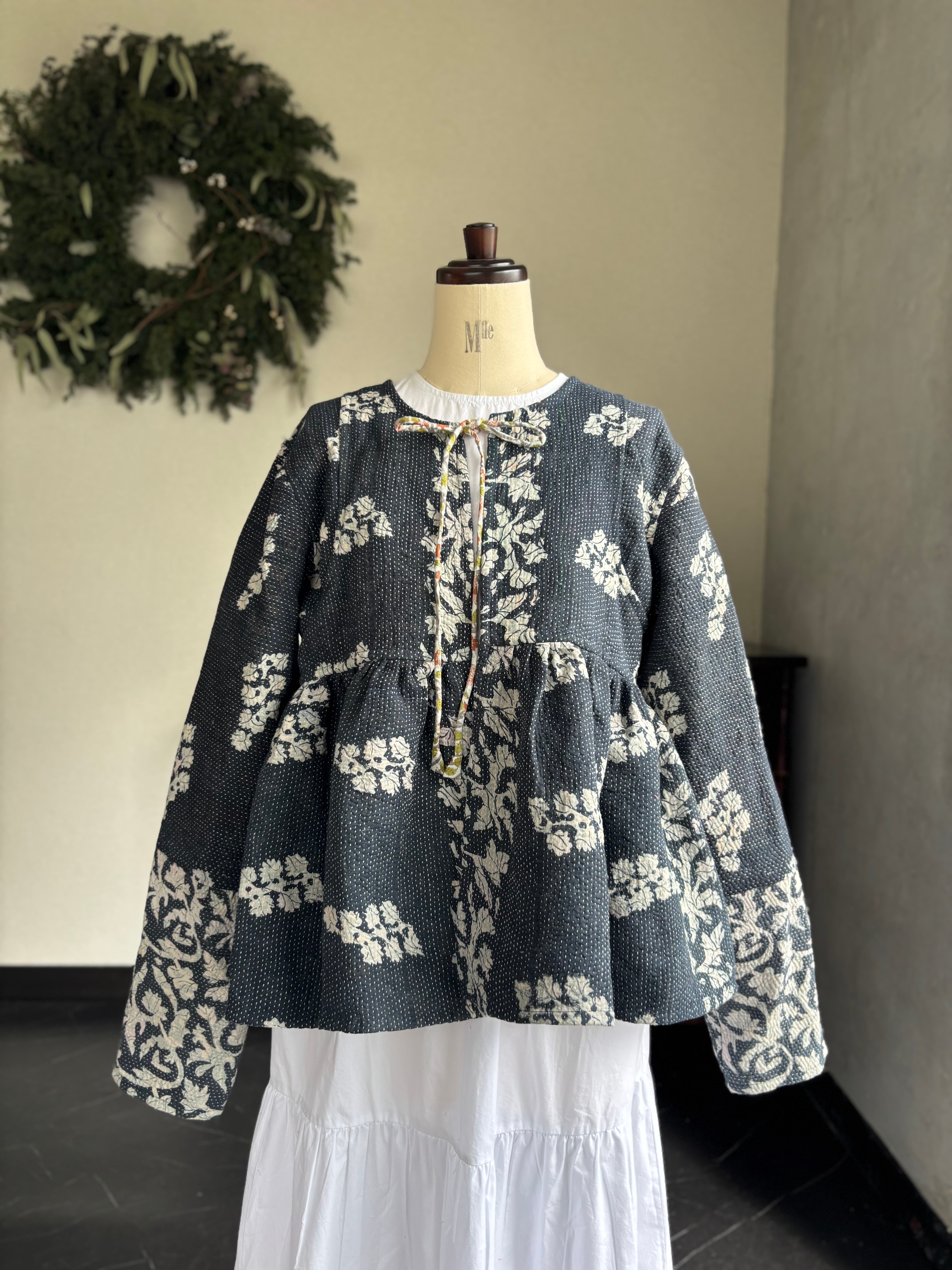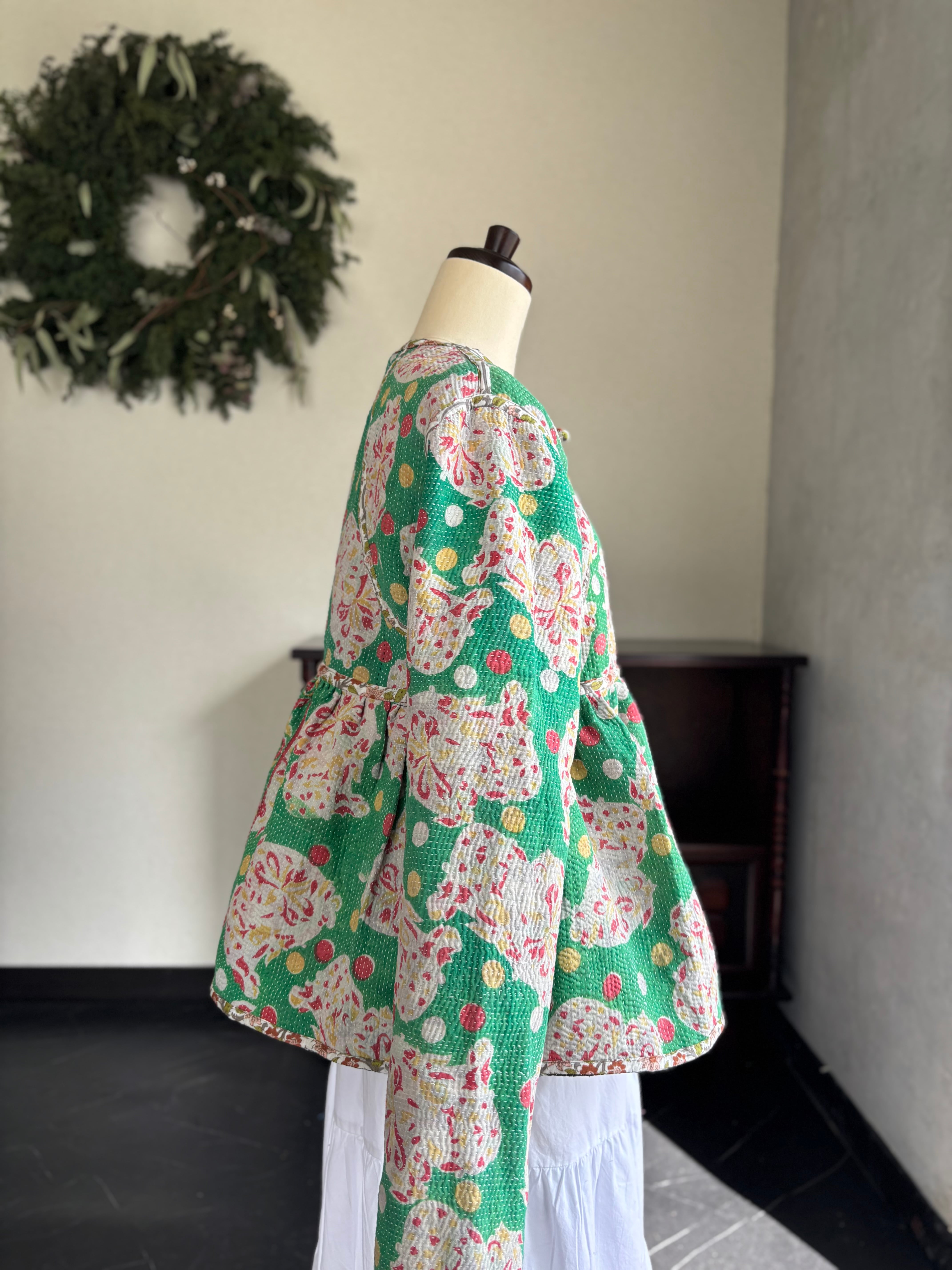 ヴィンテージのカンタ(ラリー)キルトで仕立てた、ラバリジャケットです。長い時間を旅してきた布ならではの風合いを生かした、世界にひとつだけの一点ものとなります。