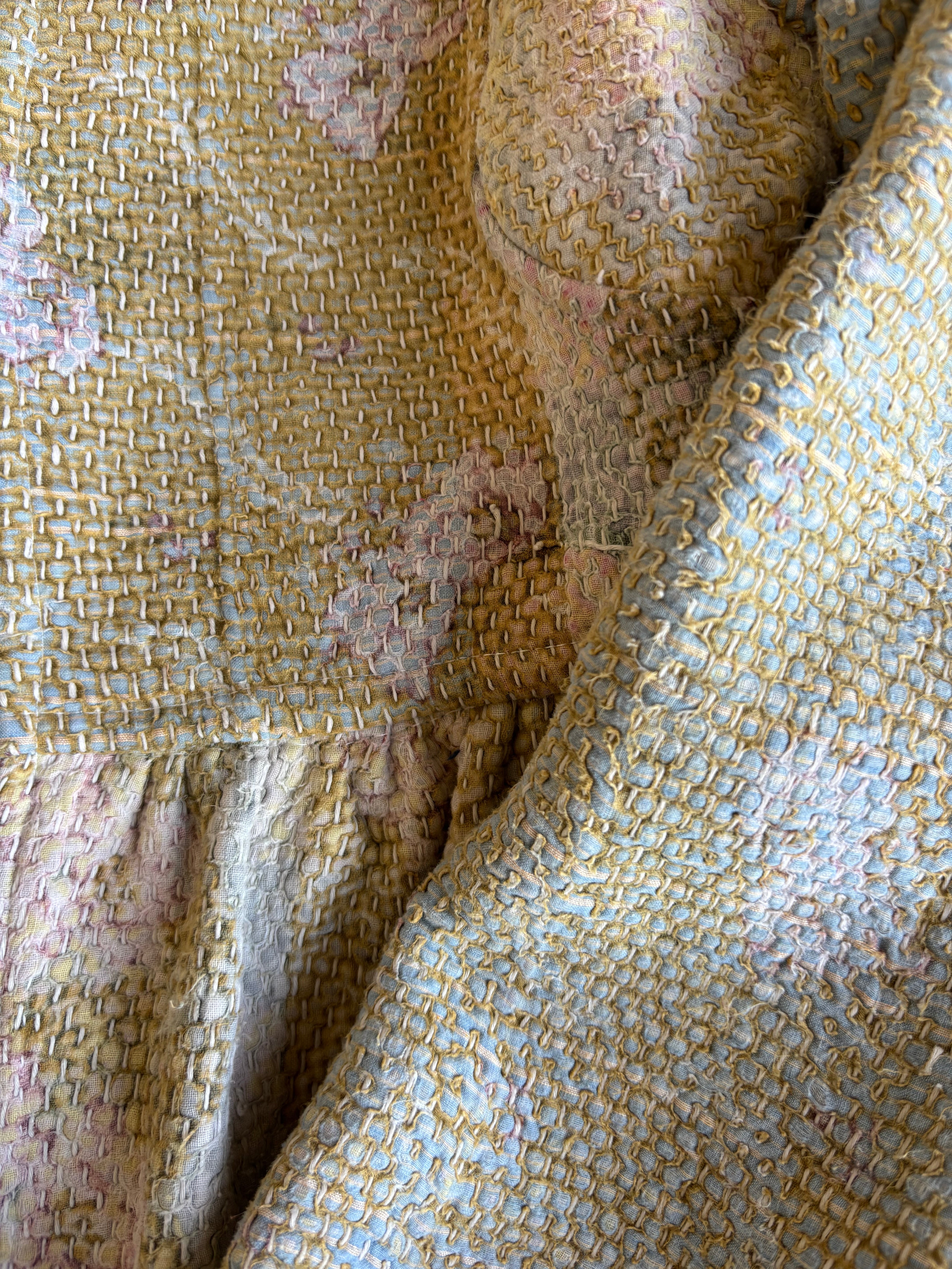 本製品は、ヴィンテージのラリー(カンタ)キルトを使用しています。インドの職人や女性たちの手仕事による、温かみのあるデリケートな生地です。手仕事ならではの不揃い感や個性
