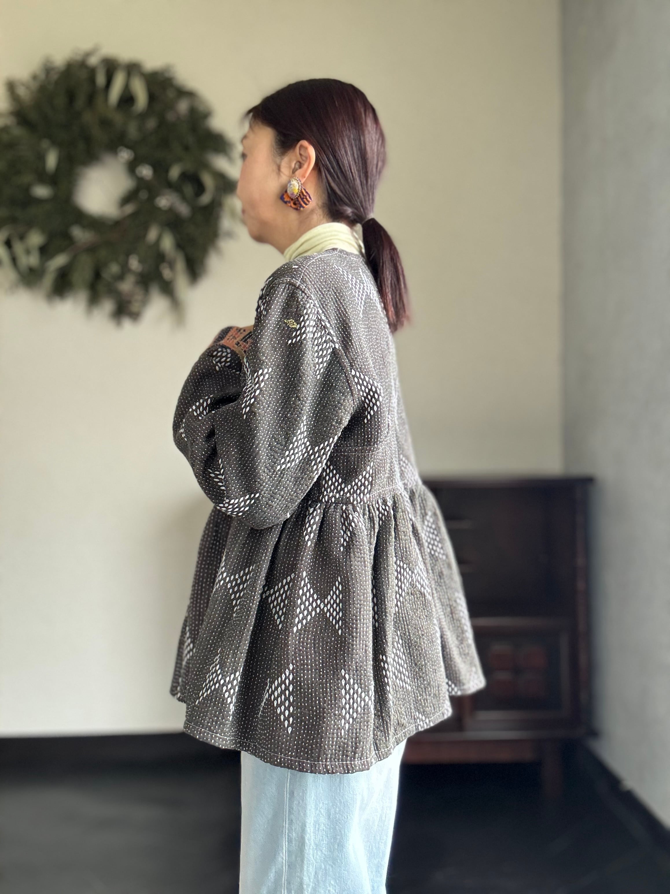 本製品は、ヴィンテージのラリー(カンタ)キルトを使用しています。インドの職人や女性たちの手仕事による、温かみのあるデリケートな生地です。手仕事ならではの不揃い感や個性