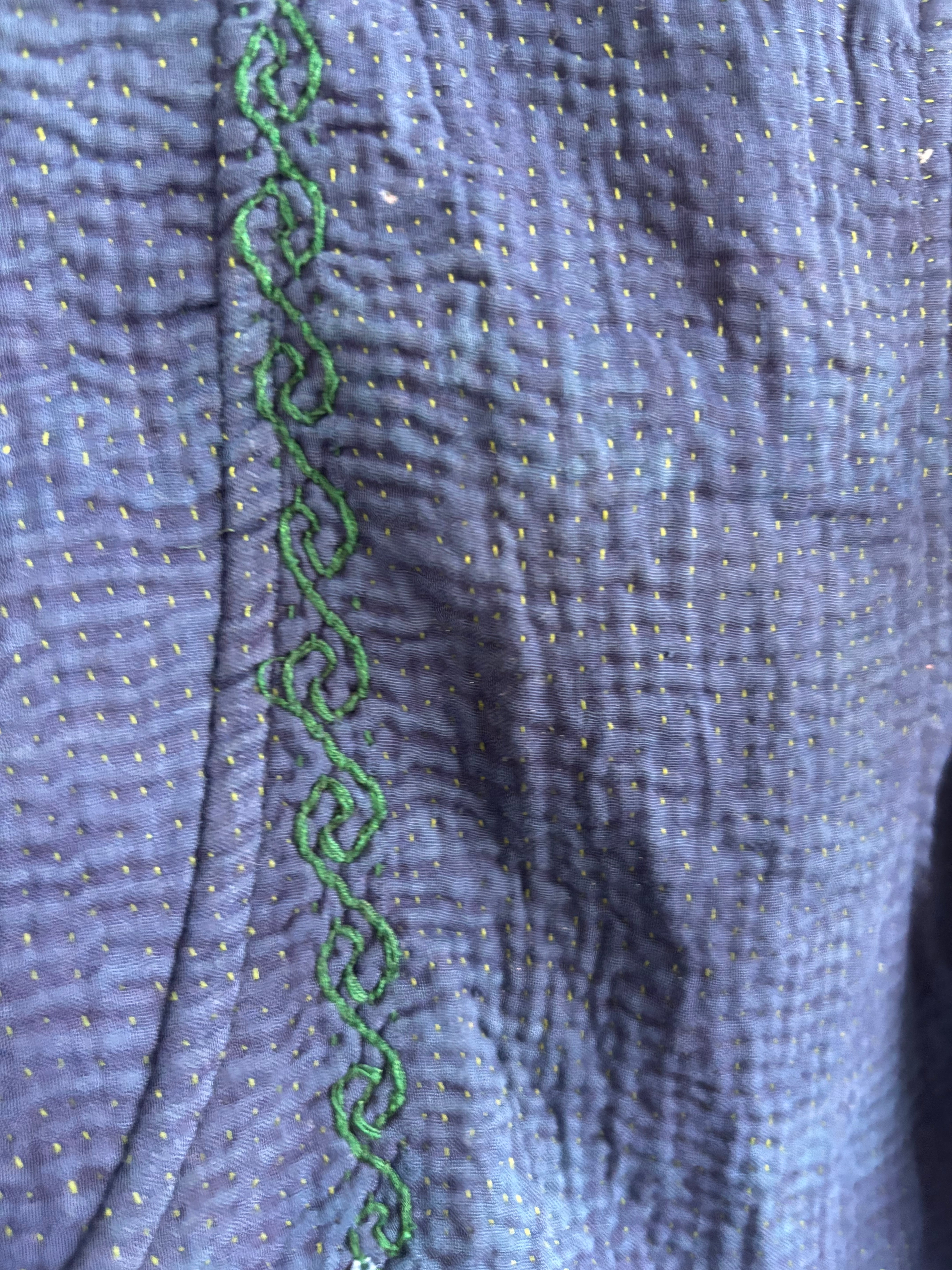 本製品は、ヴィンテージのラリー(カンタ)キルトを使用しています。インドの職人や女性たちの手仕事による、温かみのあるデリケートな生地です。手仕事ならではの不揃い感や個性