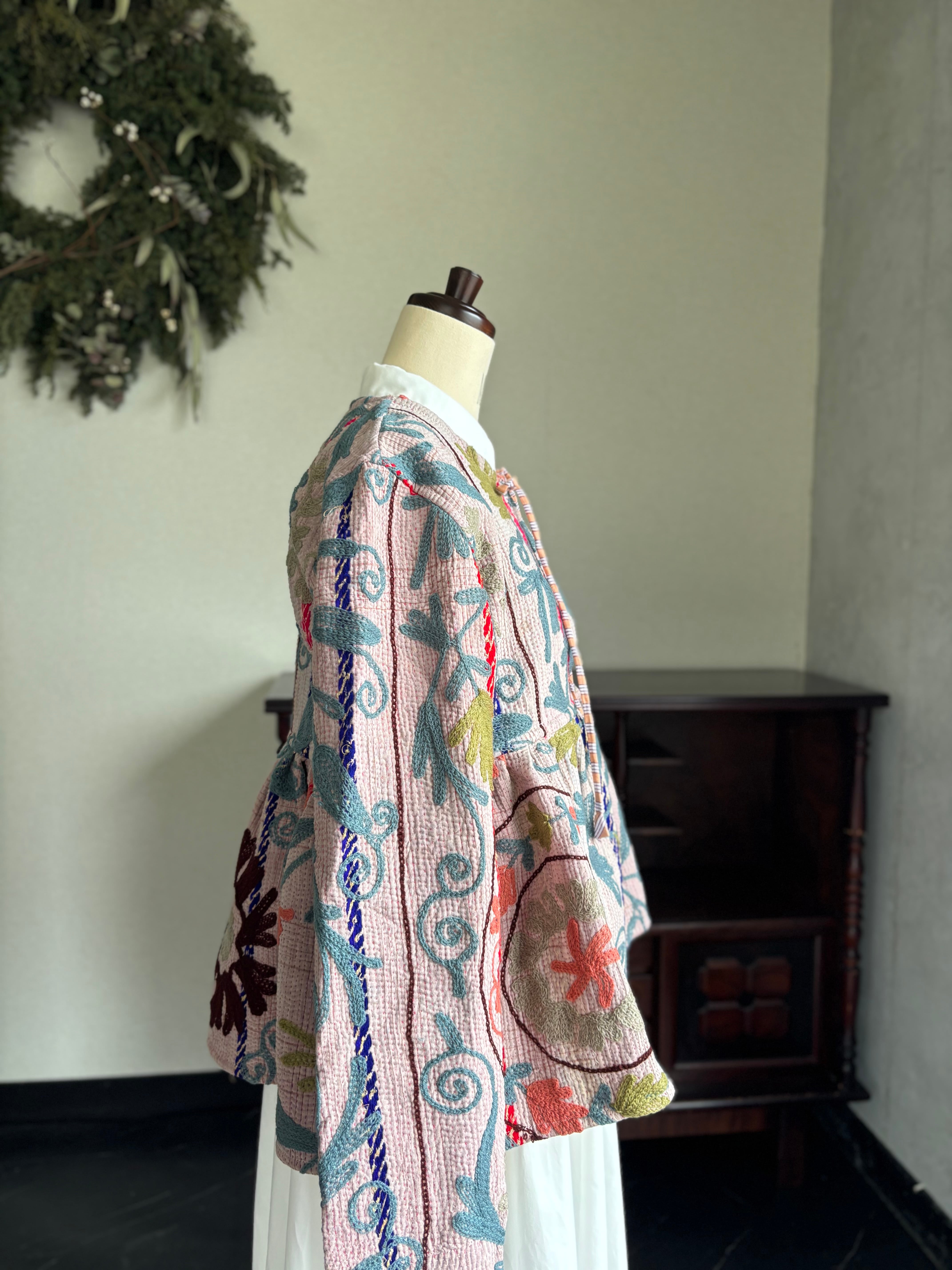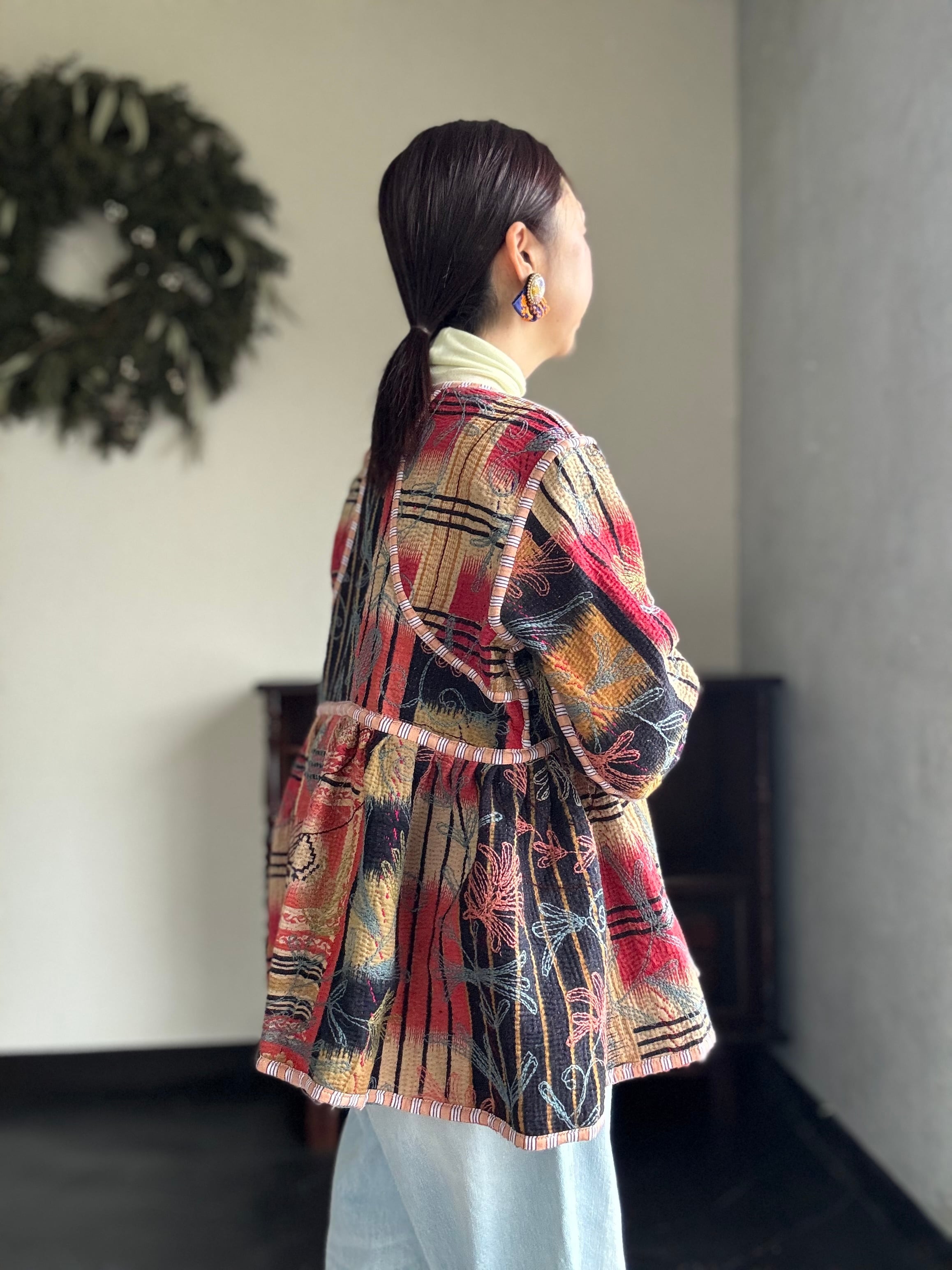 ヴィンテージのカンタ(ラリー)キルトで仕立てた、ラバリジャケットです。長い時間を旅してきた布ならではの風合いを生かした、世界にひとつだけの一点ものとなります。