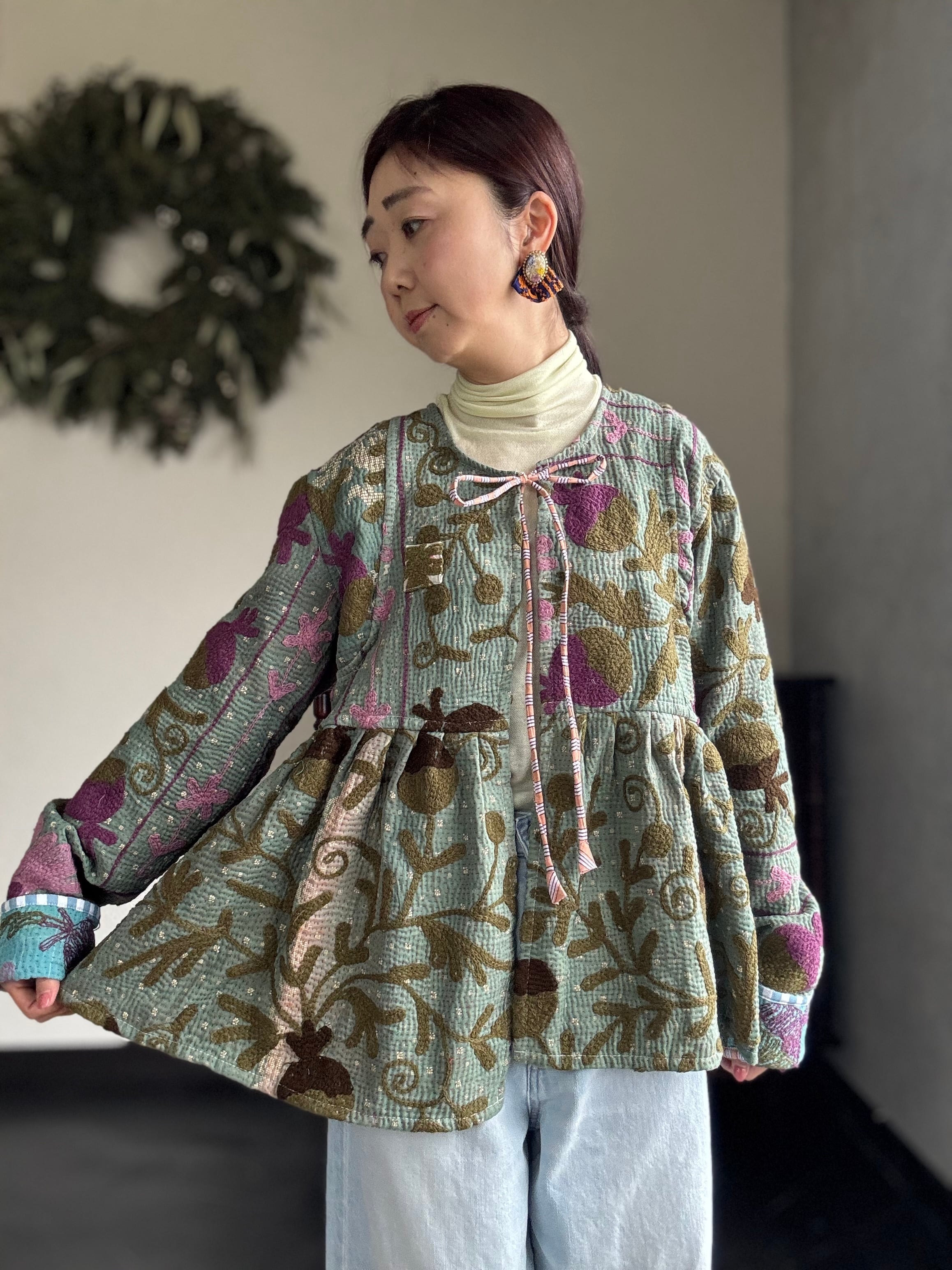 本製品は、ヴィンテージのラリー(カンタ)キルトを使用しています。インドの職人や女性たちの手仕事による、温かみのあるデリケートな生地です。手仕事ならではの不揃い感や個性