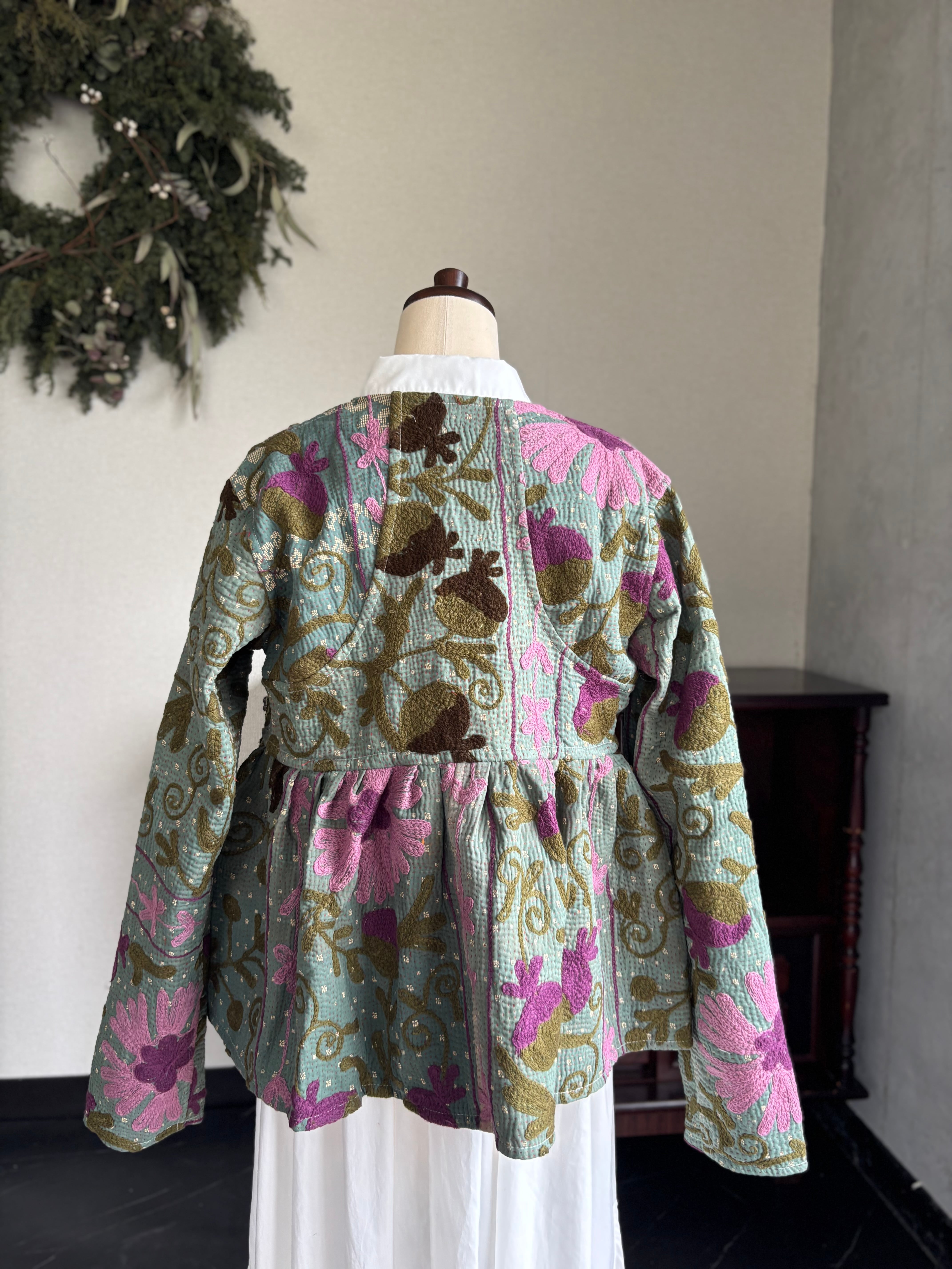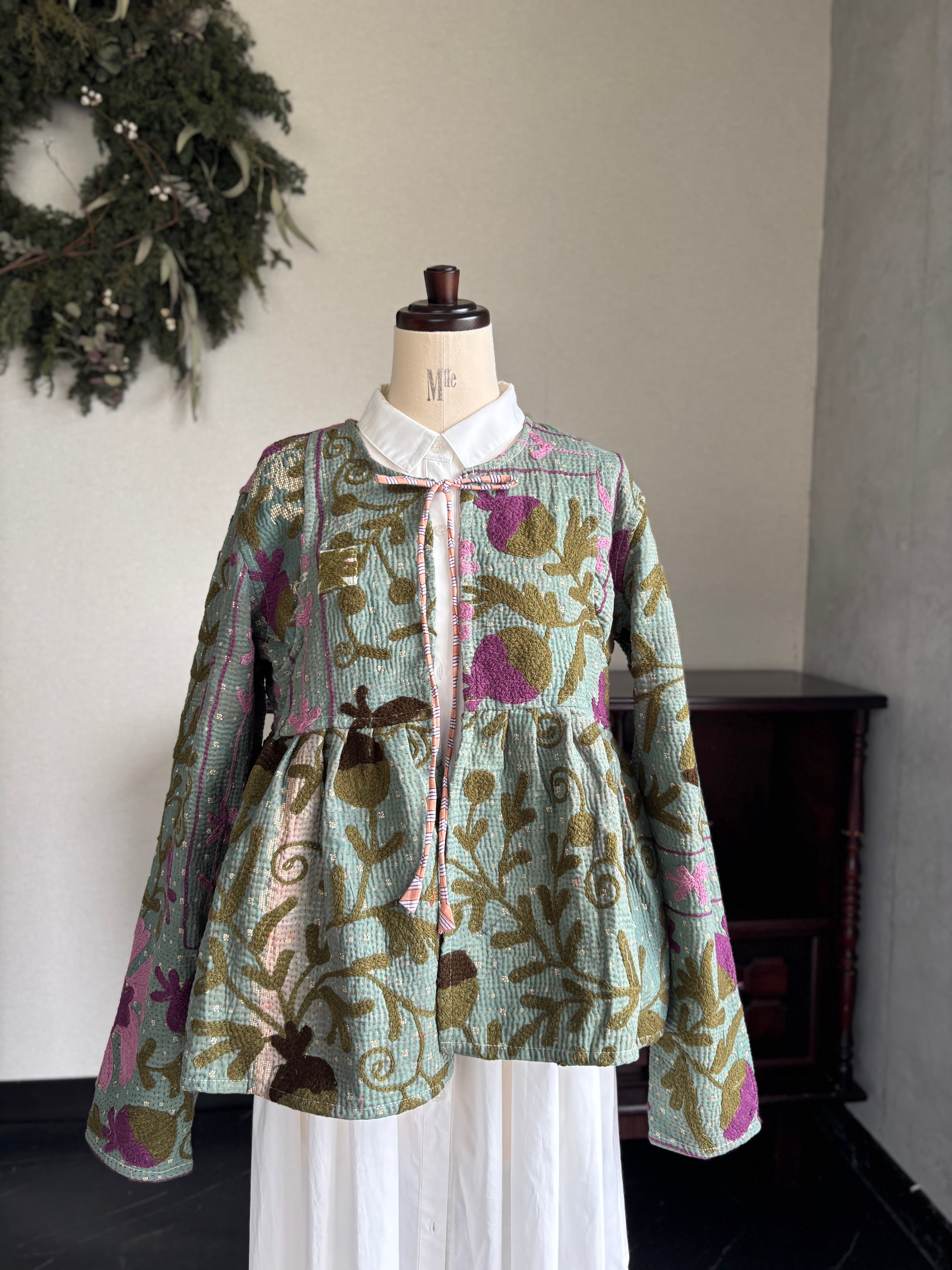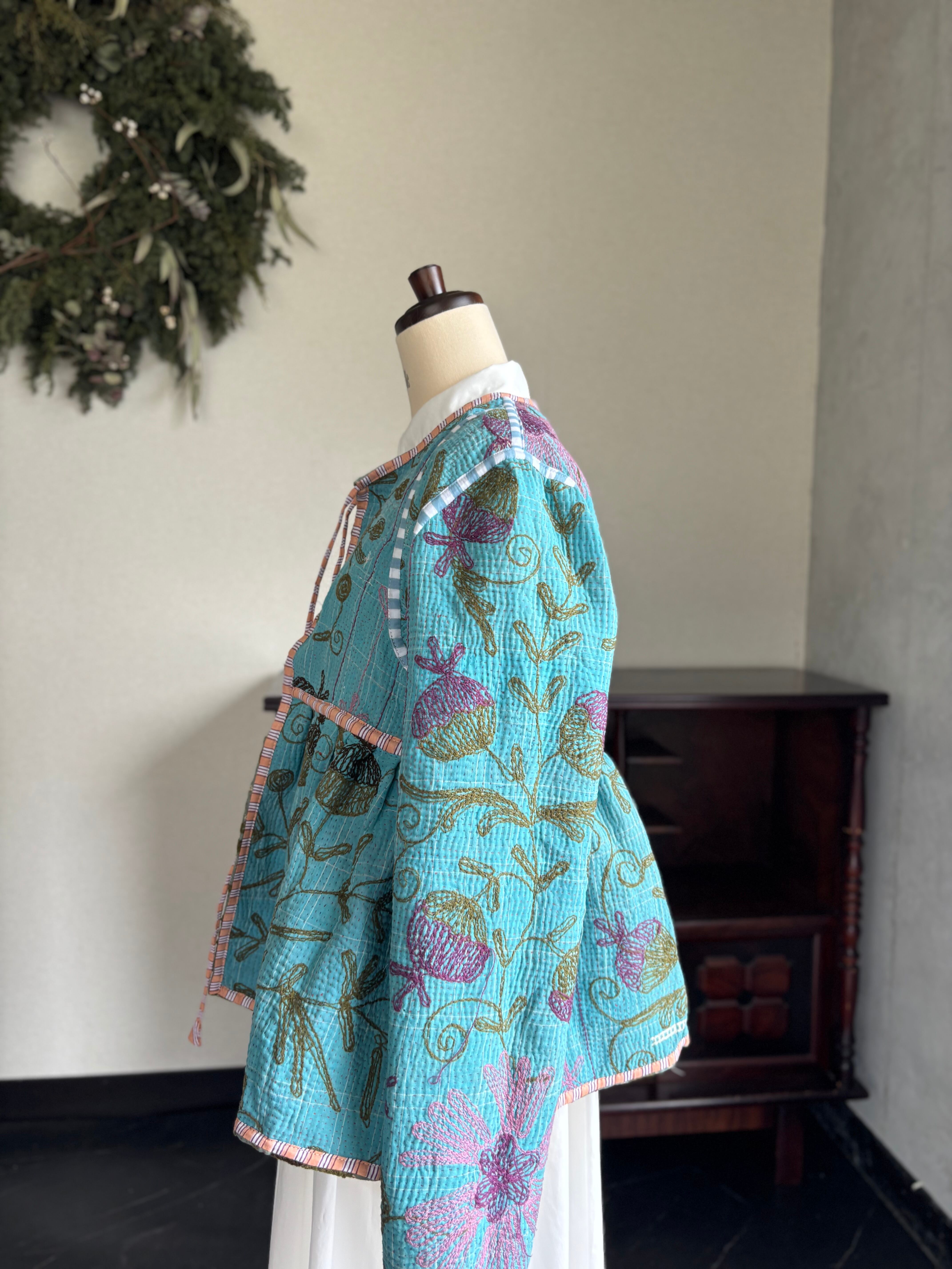 ヴィンテージのカンタ(ラリー)キルトで仕立てた、ラバリジャケットです。長い時間を旅してきた布ならではの風合いを生かした、世界にひとつだけの一点ものとなります。